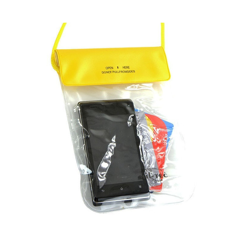 Uma capa impermeável para proteção de documentos, óculos de sol ou outras coisas valiosas. O fecho zip protege perfeitamente o conteúdo de ficar molhado. A capa é transparente e permite usar aparelhos com painel táctil. Tem uma fita ajustável para pendurar a bolsa ao redor do pescoço. A cor brilhante torna mais fácil encontrar caso se perca.