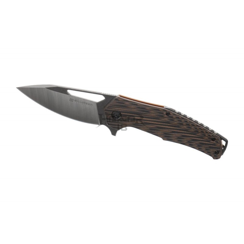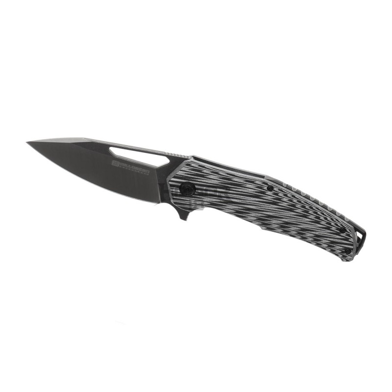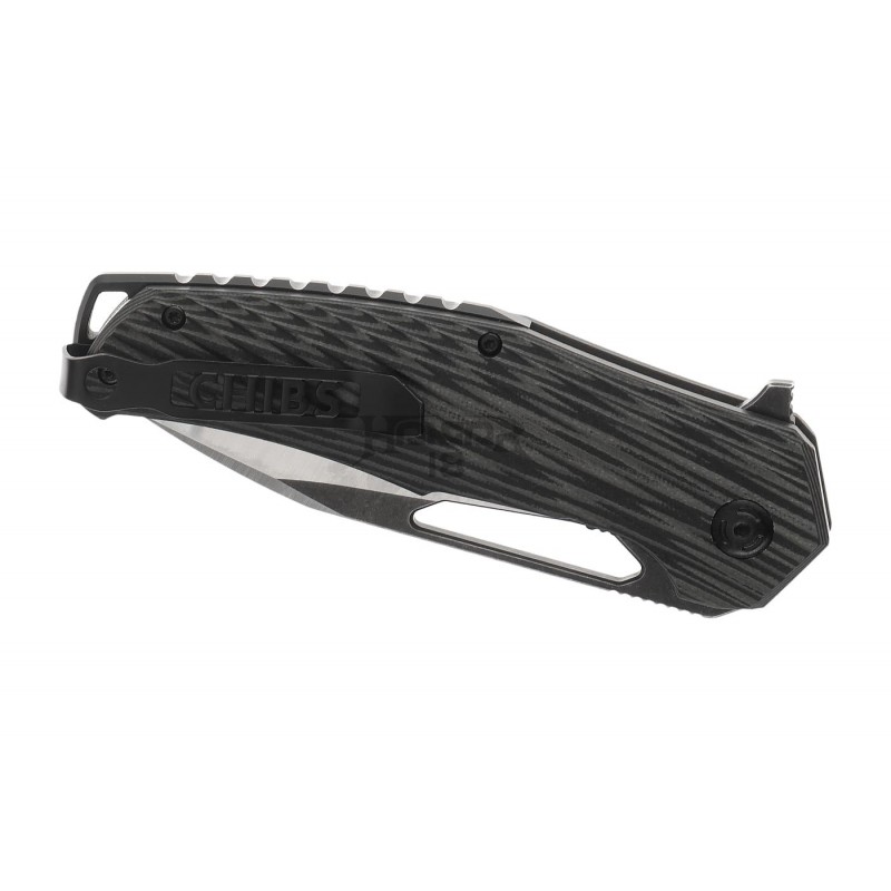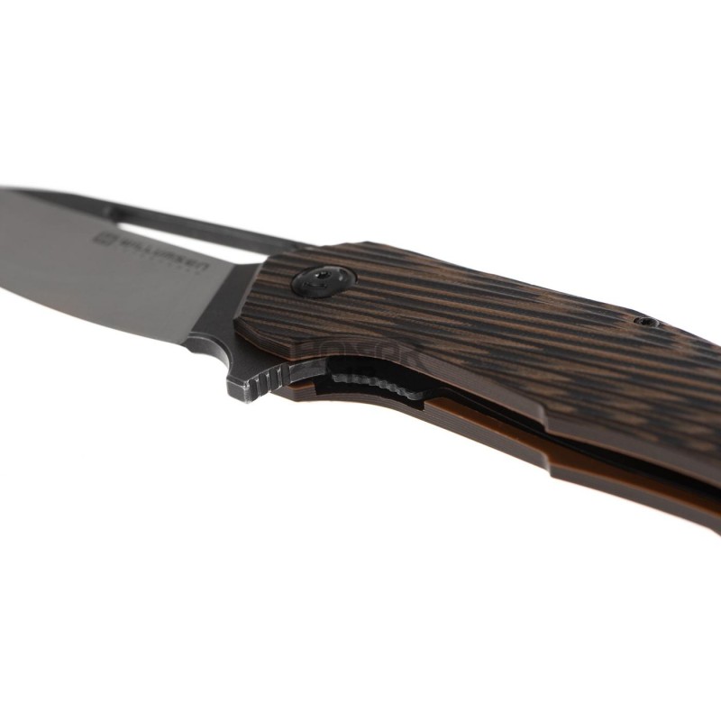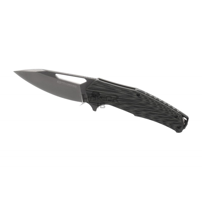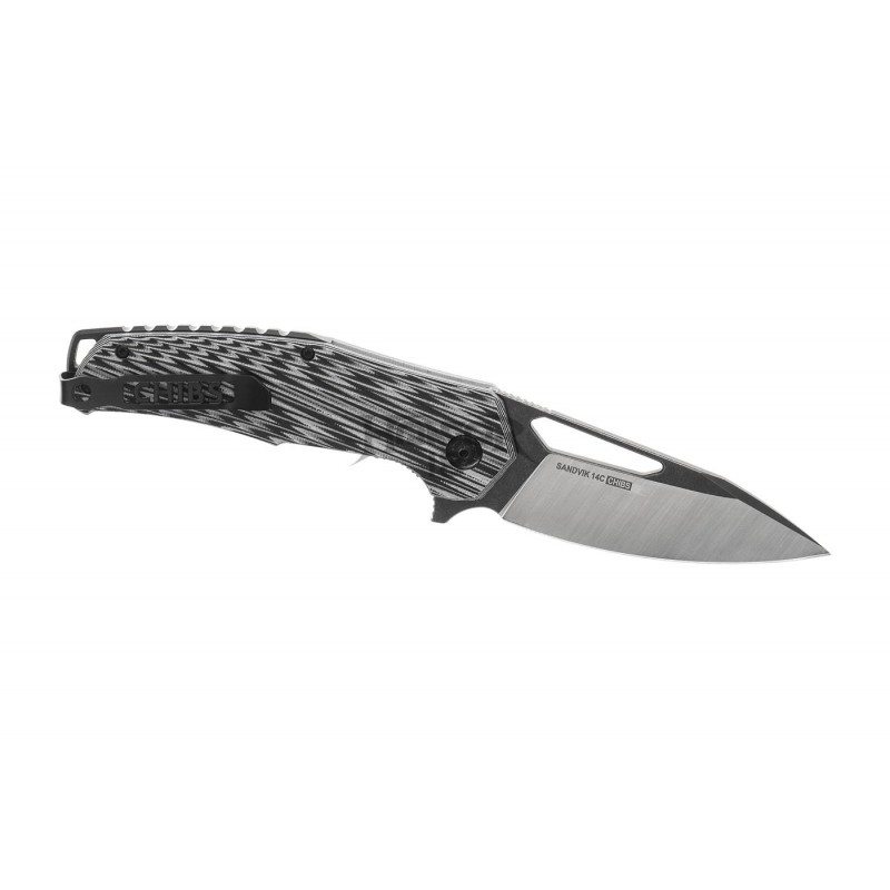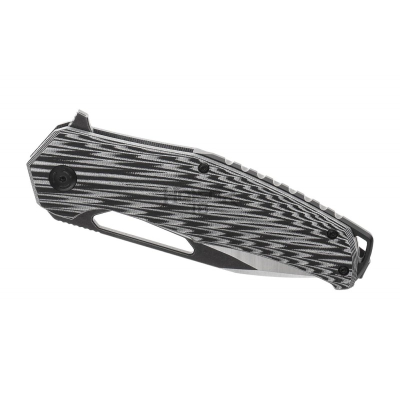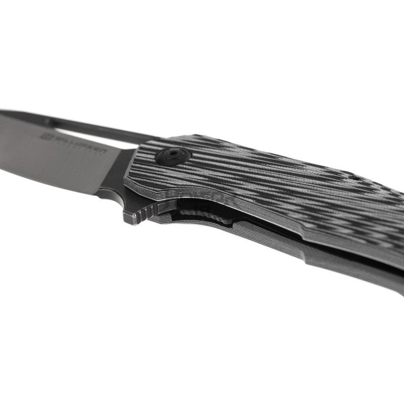 A lâmina é feita de aço Sandvik 14C de 4 mm de espessura com acabamento stonewash escuro e equipada com uma nadadeira confiável e um slot para o polegar para um posicionamento rápido e discreto.