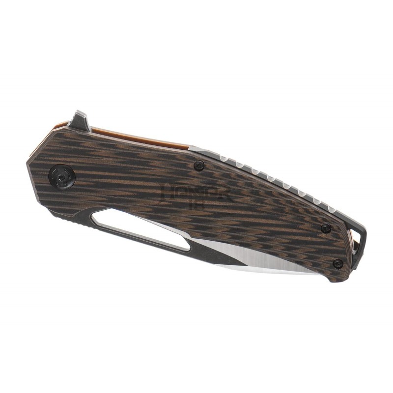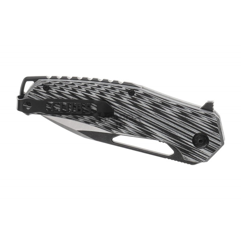 O cabo é feito de um laminado G10 de dois tons e montado em uma estrutura de aço com um mecanismo de travamento Slip Joint e um furo para cordão. O clipe de bolso removível está disponível para usuários destros e canhotos.