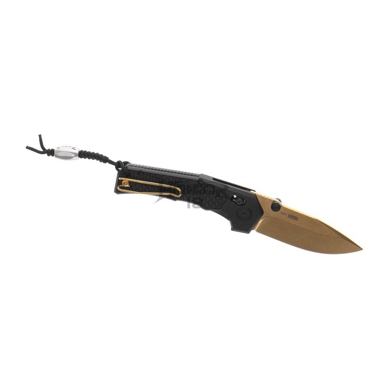 O cabo é feito de poliamida GFN laranja e montado em uma estrutura de aço com um mecanismo Axis Lock e um furo para cordão. O clipe de bolso removível está disponível para usuários destros e canhotos.