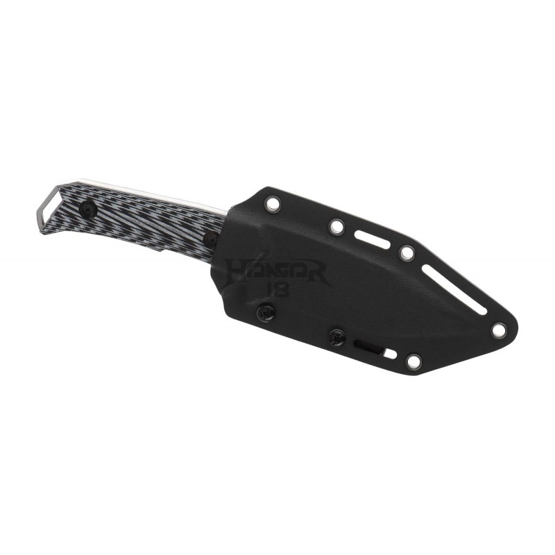 O cabo feito de laminado G10 texturizado de dois tons é montado diretamente na espiga de aço com um orifício para cordão na parte traseira.
