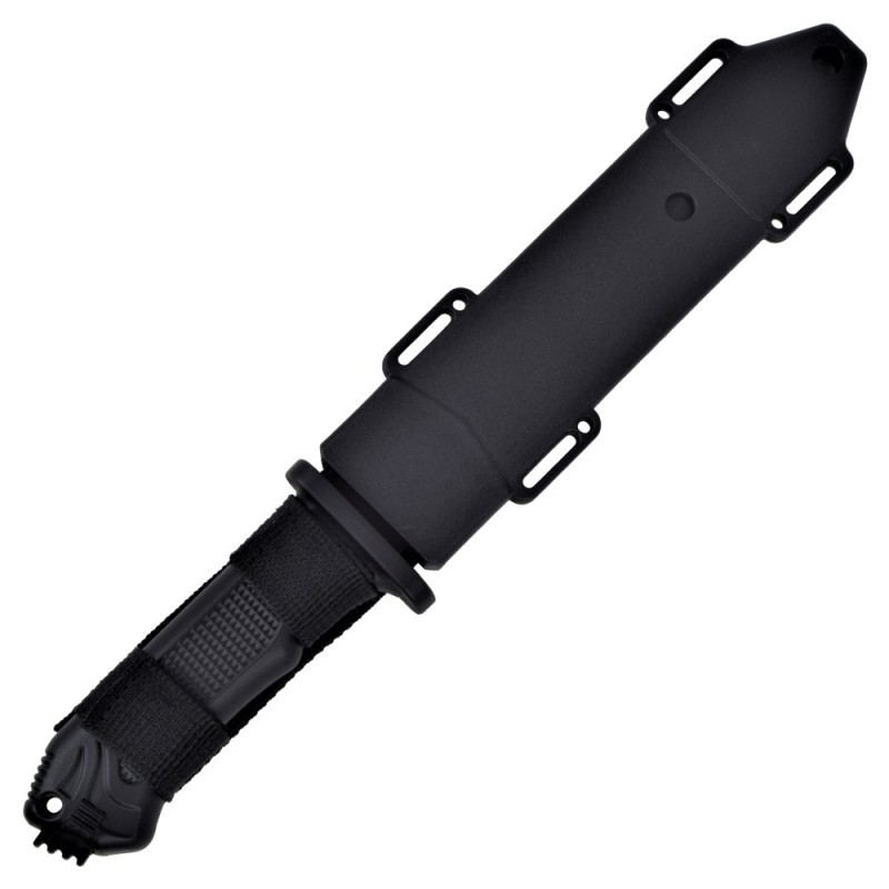 Faca de caça SCK com lâmina preta, pederneira e bainha rígida.
