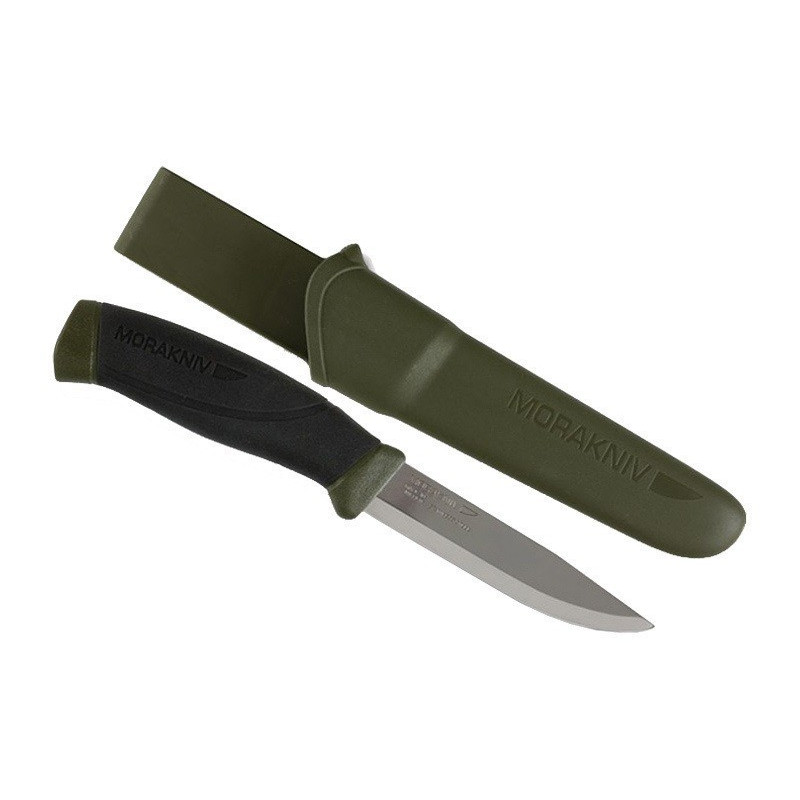 A faca Companion é perfeita para uma aventura, uma verdadeira faca versátil. A espiga corre três quartos do caminho até a faca, para que você possa trabalhar com força e precisão. A lâmina é feita de aço inoxidável, o que facilita o tratamento da faca. O punho de fricção suave é feito de borracha TPE, fazendo com que a faca pareça segura e estável para trabalhar. A bainha de faca de polímero inclui um prático prendedor de cinto para que a faca possa ser presa à mochila ou cinto - sempre à mão.