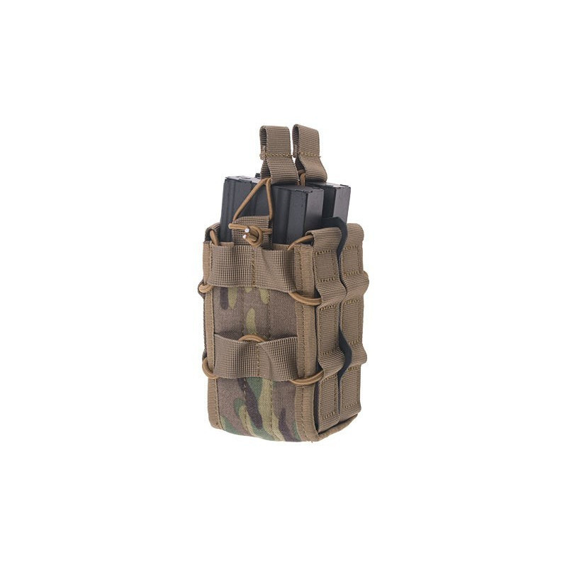 Fabricado em Cordura 500D durável da Primal Gear, uma bolsa universal dupla para 2 carregadores, que graças à possibilidade de ajuste de volume acomoda carregadores de AK / M4 / G36 / M14 / SR25 e muitos outros. O magazine é preso por cima com um cabo elástico.