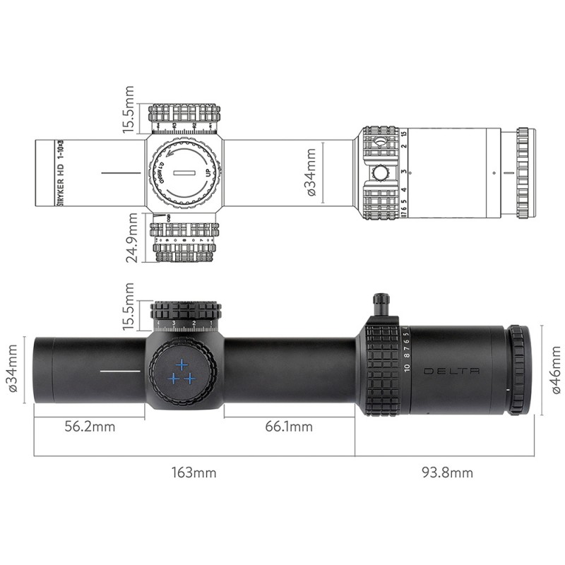 Com ampliação de 10x, a mira Delta Stryker HD 1-10x28 ajuda a localizar, identificar e atirar em alvos no alcance efetivo máximo da maioria dos rifles.