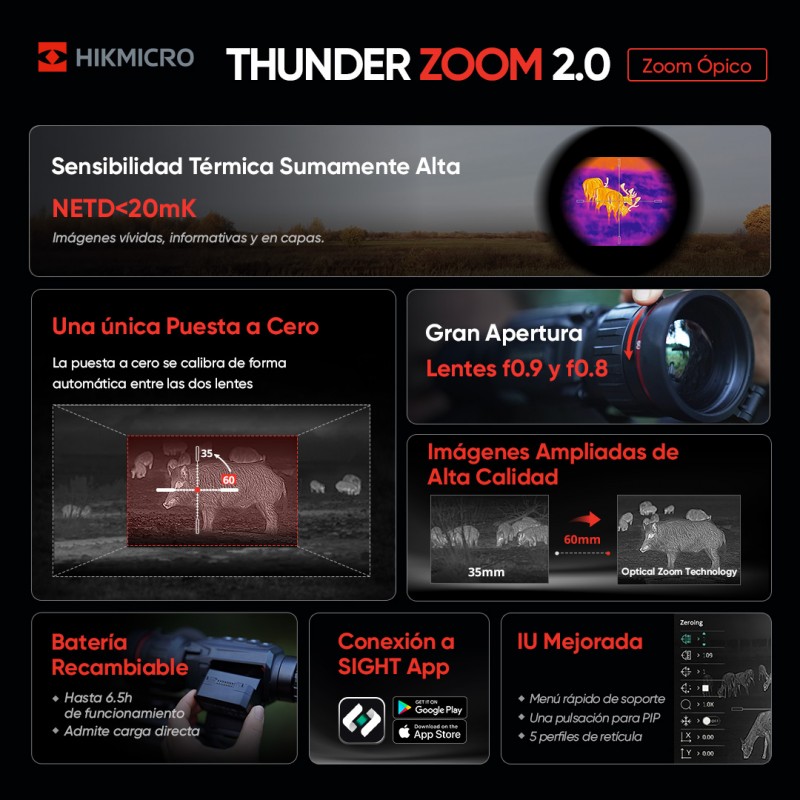 A mira térmica Thunder Zoom TH50Z 2.0 possui Zoom Óptico e sensor térmico de 20mK com resolução 384 x 288. Este dispositivo é a combinação perfeita para uso tanto em áreas florestais com vegetação abundante quanto em campos abertos. Além disso, sua grande abertura F0.8 pode fortalecer a capacidade de visualização de objetos.