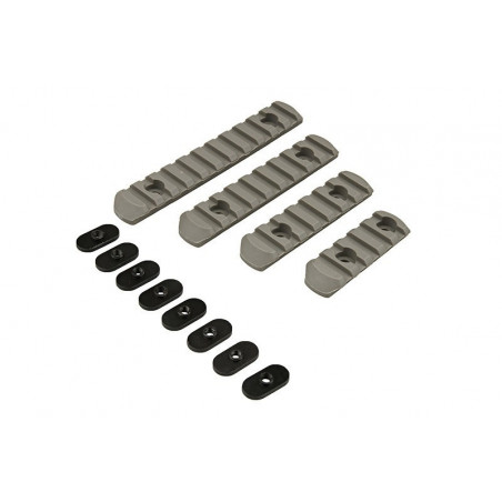 Um conjunto de quatro trilhos RIS desenhados para as pegas dianteiras do tipo MOE. Fabricado em material de polímero leve e durável. Cada trilho é equipado com um orifício para a fixação e com as ferramentas, parafusos e porcas necessárias.