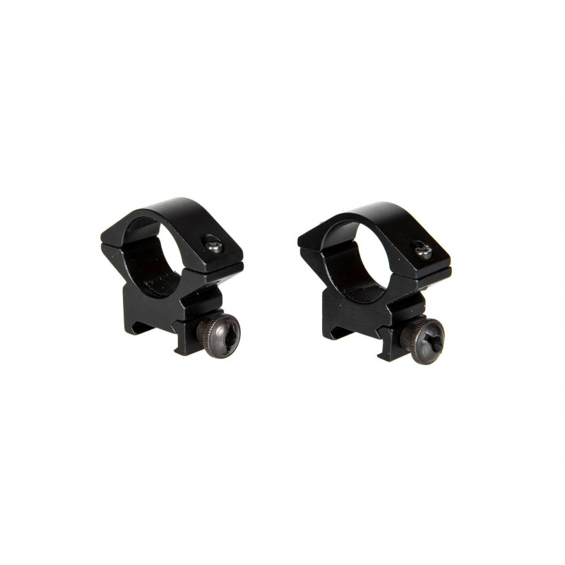 Montagem óptica de duas peças de metal. O conjunto é composto por dois anéis com diâmetro de 25,4mm, aparafusados com parafusos allen. O sistema universal permite a montagem sem problemas em qualquer réplica equipada com um trilho RIS padrão de 22 mm.