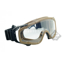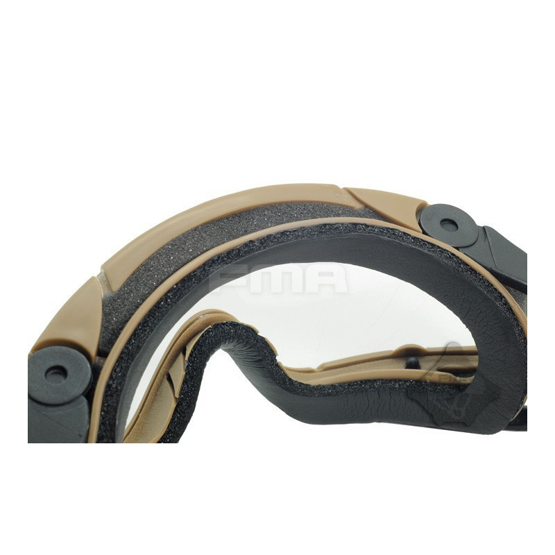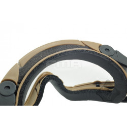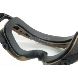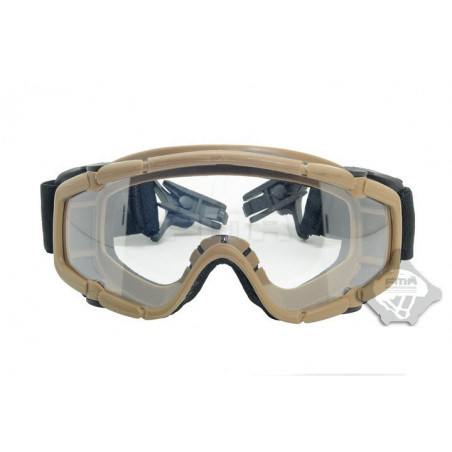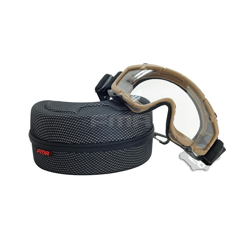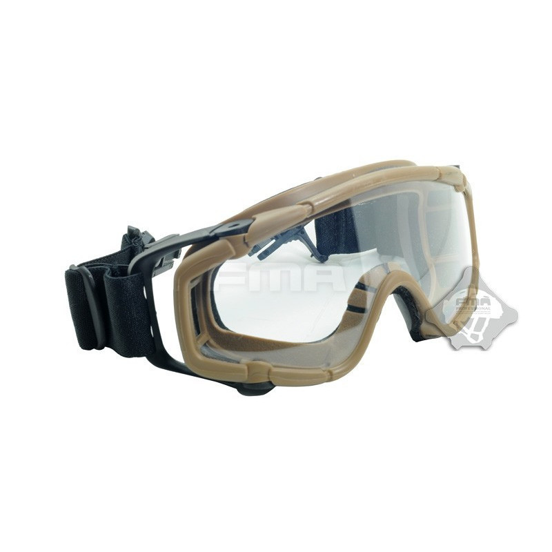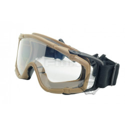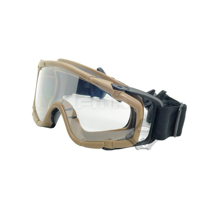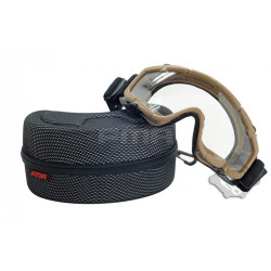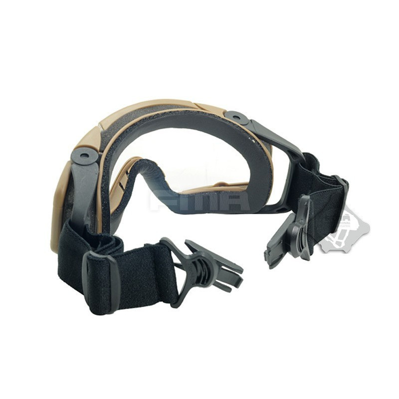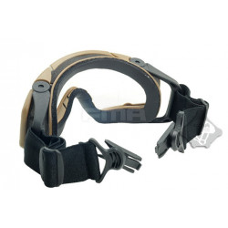 Oculos balisticos Desert com caixa e duas lentes (escura e transparente). Ajuste por fita elástica. Lente em policabornato. A fita tem encaixe para capacetes FMA ou equivalente.