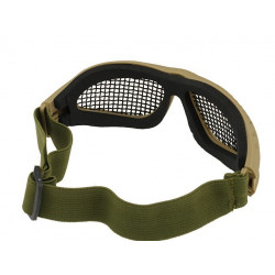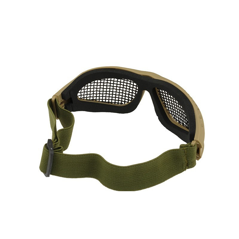 Oculos balisticos Desert com caixa e duas lentes (escura e transparente). Ajuste por fita elástica. Lente em policabornato. A fita tem encaixe para capacetes FMA ou equivalente.