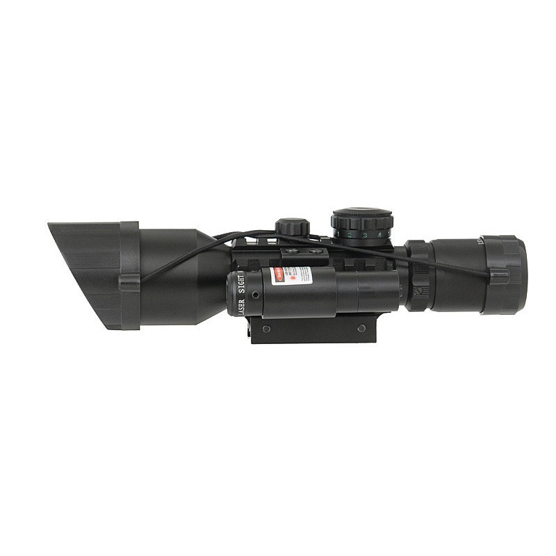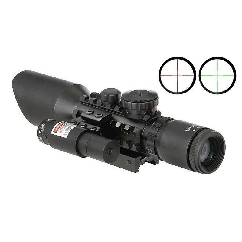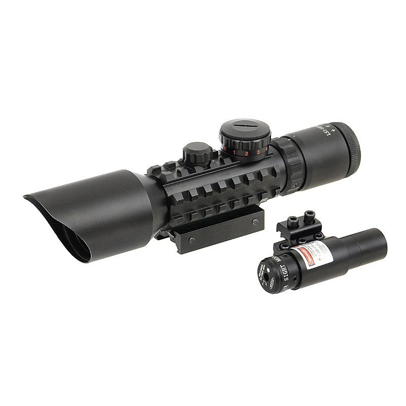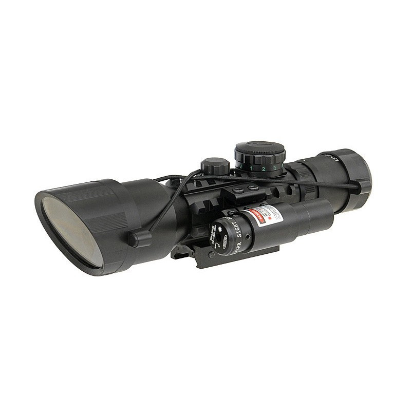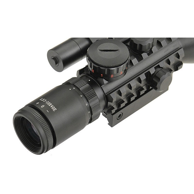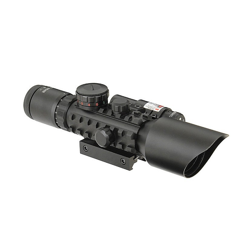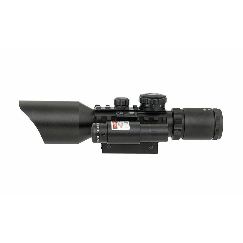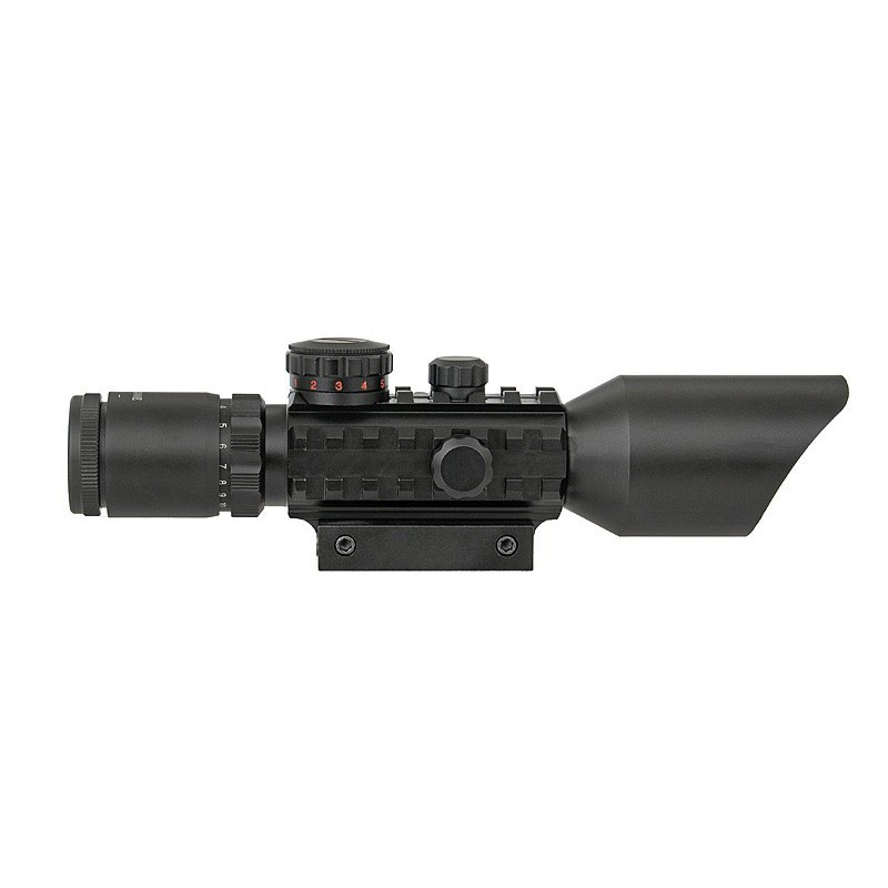 A mira telescópica é feita de metal, tem uma retroiluminação de cor vermelha e verde com uma retícula cruzada