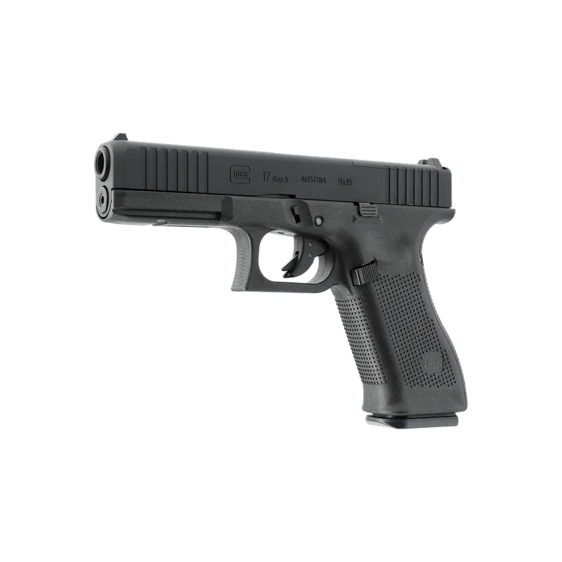Réplica licenciada da Glock 17 Gen5, acionada por CO₂, com slide metálico e sistema MOS.