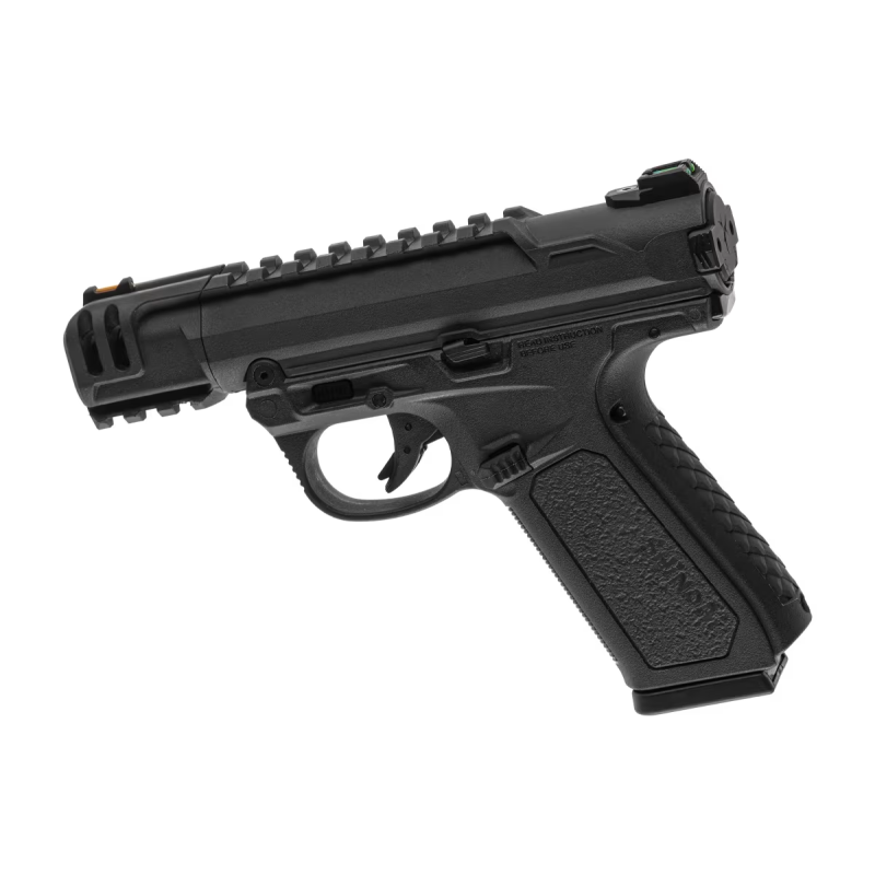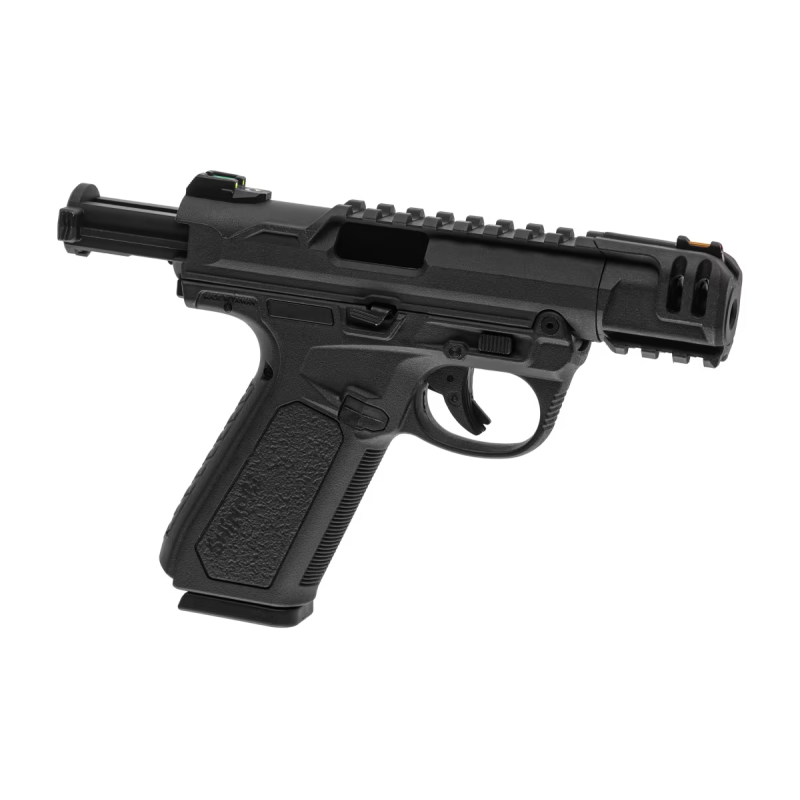 Pistola GBB compacta, semi/full-auto, corpo em polímero, cano curto e trilhos superiores e inferiores para acessórios. Potência ~0,95 J.