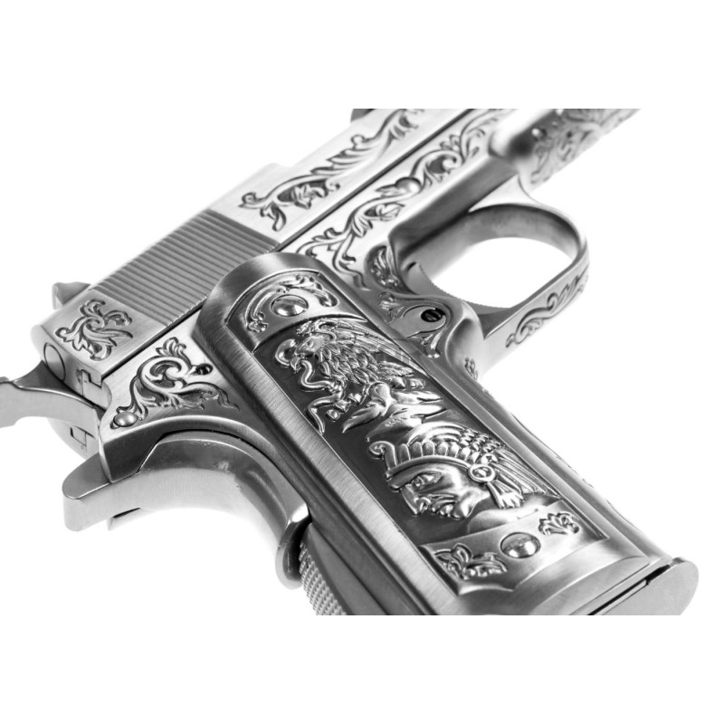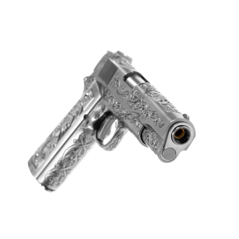 O M1911 Etched implementa um slide móvel e um sistema de blowback de gás robusto (GBB) que imita o recuo e a ação do slide durante o disparo. Ele fornece uma experiência de usuário excepcional e realista, como atirar com uma pistola autêntica. Além disso, a arma oferece um mecanismo de hop-up ajustável para melhorar a precisão e a estabilidade do BB durante o tiro.