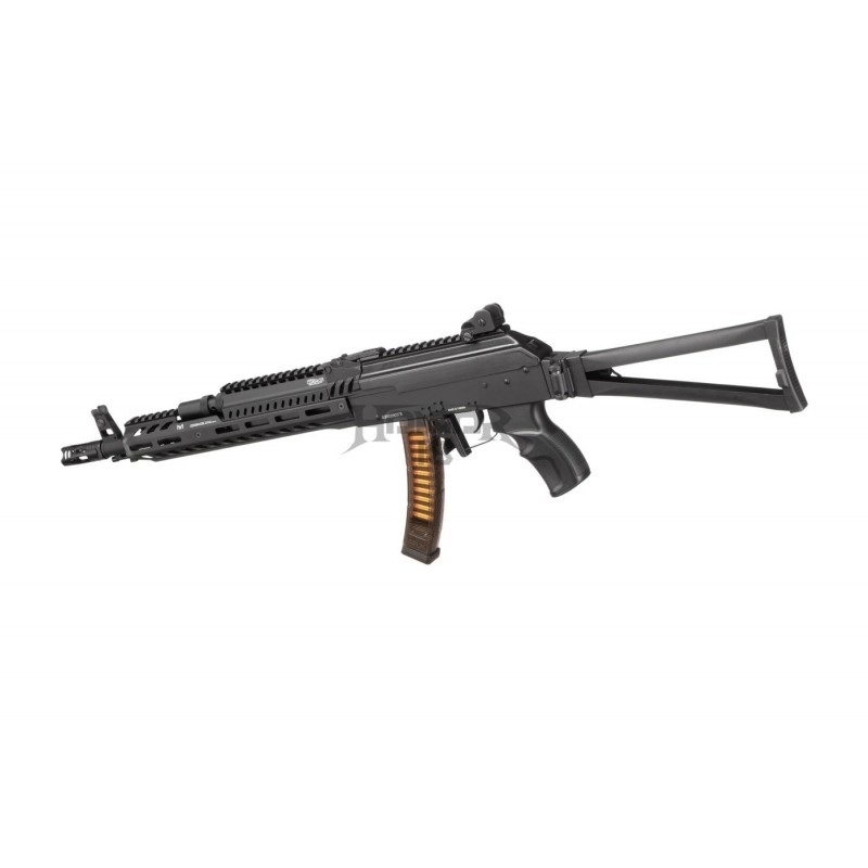 Projetado e fabricado pela G&G, o PRK9EL é uma réplica de alta qualidade de um híbrido AK e PP-19-01. O modelo do comprimento de uma carabina é equipado com um punho de pistola anatômico, coronha dobrável e um protetor de mão de alumínio alongado. Esta réplica de 630/875 mm de comprimento é alimentada por um carregador de baixa capacidade, pesa cerca de 3.000 g e dispara em modo semiautomático e totalmente automático. A réplica é feita principalmente de ligas metálicas de alta qualidade, aço e polímeros. O corpo, o guarda-mão, o cano externo e as miras são usinados em metal. O punho da pistola e o carregador são fabricados em polímero, com guarda-mato, coronha e alguns elementos menores feitos de aço. Na parte frontal, podemos encontrar um handguard M-LOK de alumínio com um trilho na parte superior. Esta configuração permite que o usuário conecte diferentes acessórios adequados à sua preferência ou requisitos de missão. O cano é equipado com uma rosca CCW de 14 mm e pode receber diferentes dispositivos de focinho, supressores e rastreadores. A coronha retrátil dobrável lateralmente feita de polímero de alta qualidade é confortável de usar. Também é fácil de manusear em espaços confinados e simples de guardar. A bateria é colocada sob a tampa contra poeira. A caixa de engrenagens V3 equipada com MOSFET é pareada com um sistema ETU inovador para excelente tempo de reação do gatilho e qualidade. Graças aos materiais de qualidade e alto desempenho, o PRK9L é a escolha ideal para jogadores que buscam uma réplica de primeira classe.