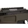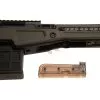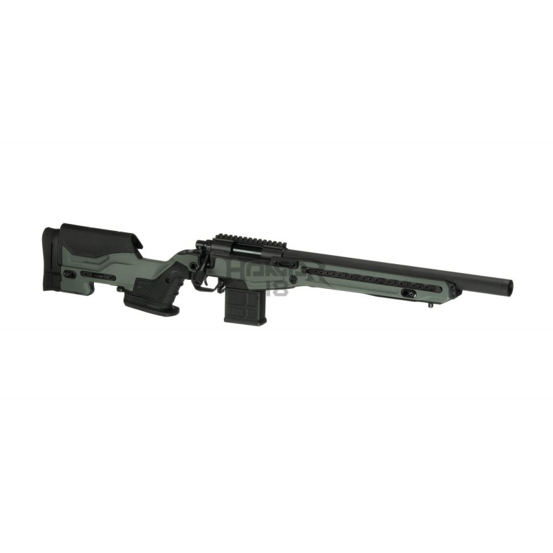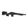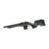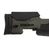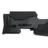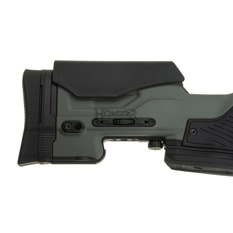 O estoque é feito de polímero robusto e contém sistemas de montagem feitos de alumínio usinado em CNC. O comprimento do puxão pode ser regulado adicionando espaçadores e o riser de bochecha é ajustado com um mecanismo embutido.
