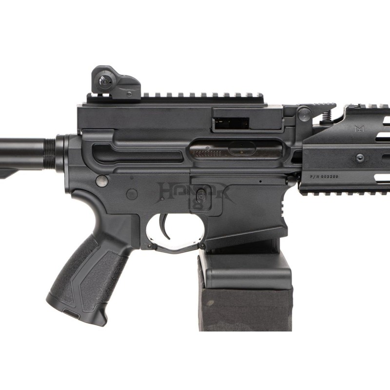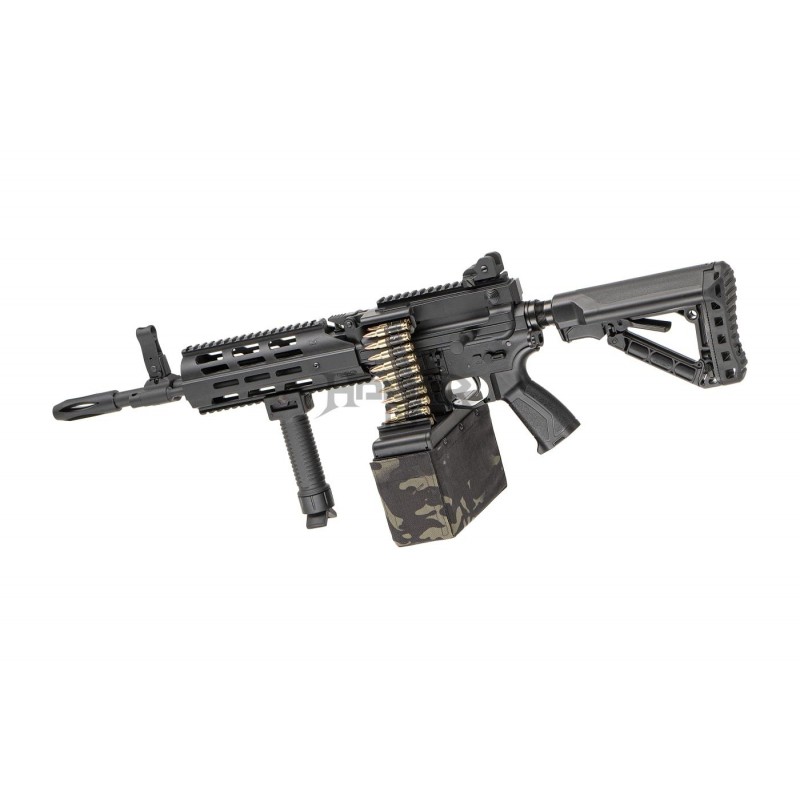 Projetado e fabricado pela G&G, o CM16 LMG é uma réplica de alta qualidade desenvolvida no projeto Combat Machine. A ideia principal da CM era entregar um modelo acessível, mas ainda fornecendo uma alta qualidade de mecanismos internos e o uso dos melhores materiais possíveis disponíveis. Esta réplica de 740/830 mm de comprimento é alimentada por um carregador hicap elétrico, pesa cerca de 4.300 g e dispara em modo semiautomático e totalmente automático. Elementos principais como um receptor inferior e superior, guarda-mão e coronha são fabricados a partir de polímeros de alta qualidade reforçados com fibra de vidro, tornando-o leve, mas altamente durável. O cano externo, o tubo de proteção e outros elementos menores são usinados em metal. Na frente, podemos encontrar um handguard de polímero M-LOK com um trilho RIS na parte superior. Esta configuração permite que o usuário conecte diferentes acessórios adequados à sua preferência ou requisitos de missão. O cano é equipado com uma rosca CCW de 14 mm e pode receber diferentes dispositivos de focinho, supressores e rastreadores. A coronha retrátil feita de polímero de alta qualidade é confortável de usar. Também é fácil de manusear em espaços confinados e simples de guardar. A bateria é colocada dentro do tubo de buffer. A caixa de engrenagens V2 equipada com MOSFET é pareada com um sistema ETU inovador para excelente tempo de reação do gatilho e qualidade. Graças aos materiais econômicos, tamanho compacto e alto desempenho, a CM16 LMG é a escolha ideal para novos jogadores e veteranos que buscam uma réplica de primeira classe em uma faixa de preço razoável.