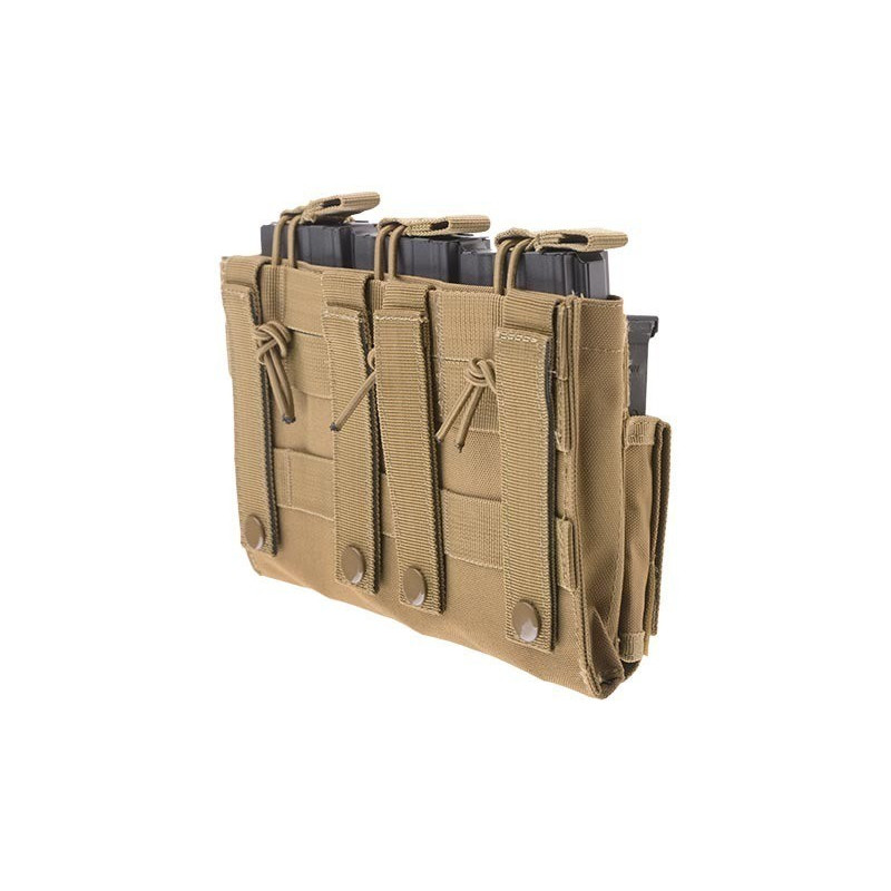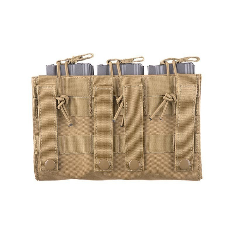 Uma bolsa tripla para carregadores AR-15 e carregadores de pistola. Os carregadores longos são presos com um cordão elástico e uma faixa que simplifica sua retirada, enquanto os curtos são presos por uma aba de velcro.
